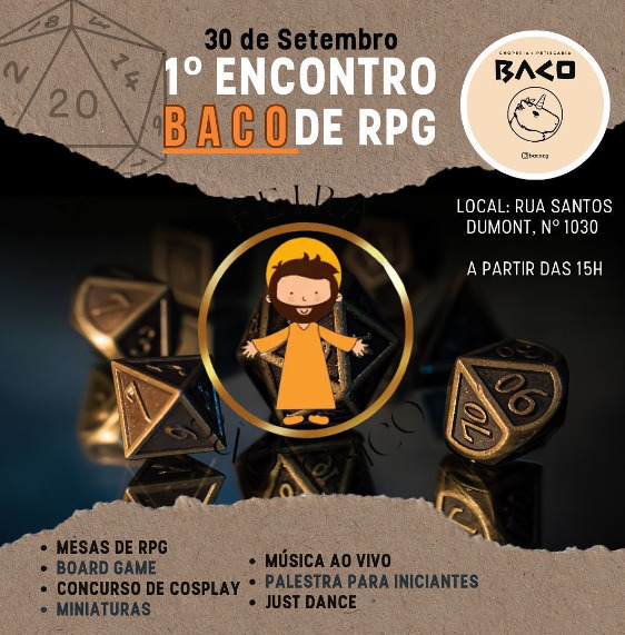 Neste sábado, acontece o 1º Encontro Baco de RPG, no Baco Bar. No local os visitantes encontrarão mesas de RPG, concurso de cosplay, palestra, Just Dance e vendas de miniaturas.