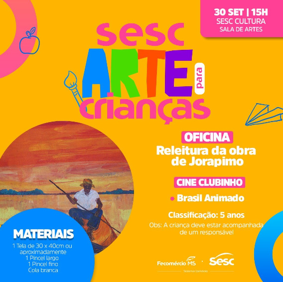 Sábado, às 15h, acontece mais uma edição do Sesc Arte Para Crianças, onde será ensinado sobre a obra do mestre Jorapimo, grande representante da arte sul-mato-grossense. Na oficina, os participantes se inspiraram no tema e técnica do artista para realizar uma releitura sobre a tela.