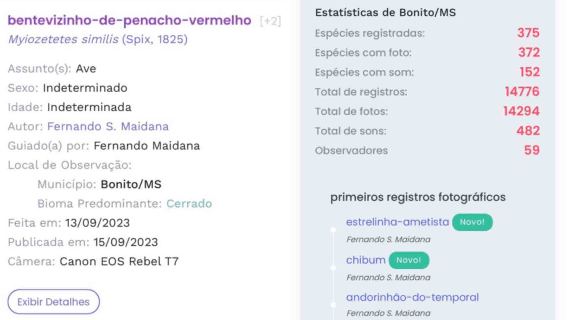 Em seguida, Fernando disse que compartilhou os registros com o Wikiaves, que cataloga espécies em todo o país, constatando que, desde 2021, não havia novos registros no município. No caso do beija-flor híbrido, foi o primeiro registrado do Estado. A estrelinha ametista, por exemplo, também foi registrada pela primeira vez em Bonito.