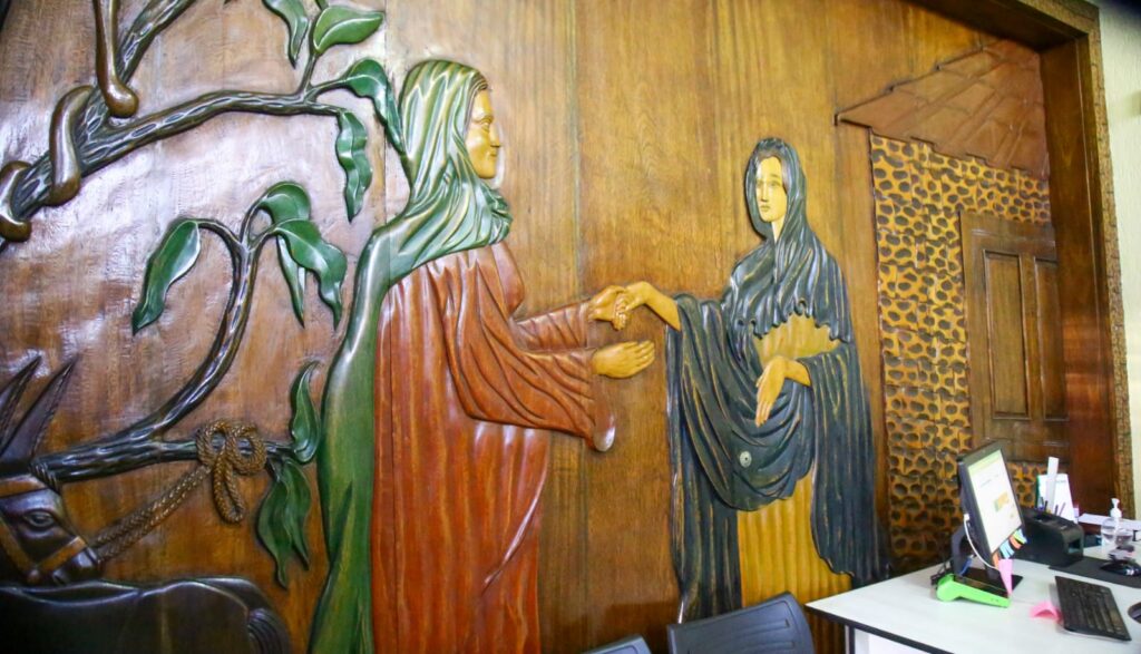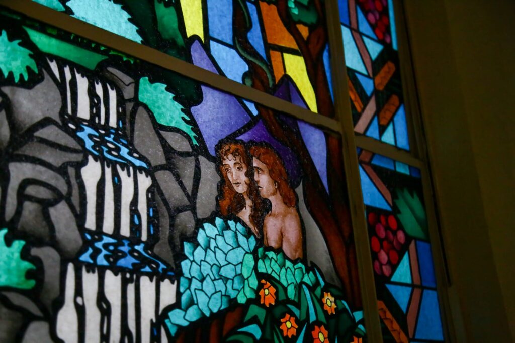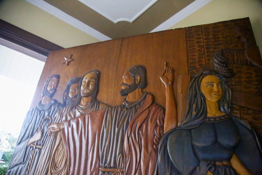 Dos vitrais coloridos e muito bonitos até grandes e pesadas portas de madeira entalhada com representações religiosas, a paróquia é repleta de detalhes artísticos para apreciar. Esses dois elementos, os vitrais e as portas, contam juntos a história do mundo e de Jesus Cristo segundo passagens bíblicas, explica a secretária da paróquia, Lucimaira Freitas, que recepciona pessoas diante de um entalhe que mostra a Virgem Maria e Santa Isabel.