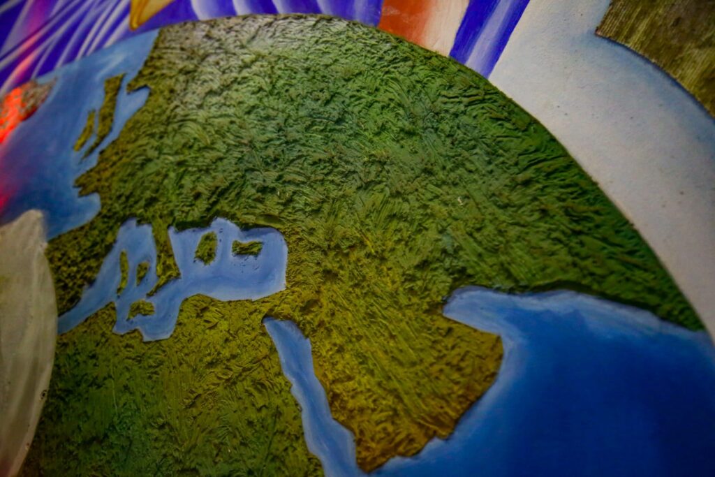 Só subindo no altar para reparar a técnica de pintura das letras e também do globo terrestre que está à frente das pernas e pés da figura de Jesus Cristo. A porção continental verde do planeta, pintada em alto-relevo, dá a ideia de vegetação e de valor às riquezas naturais.