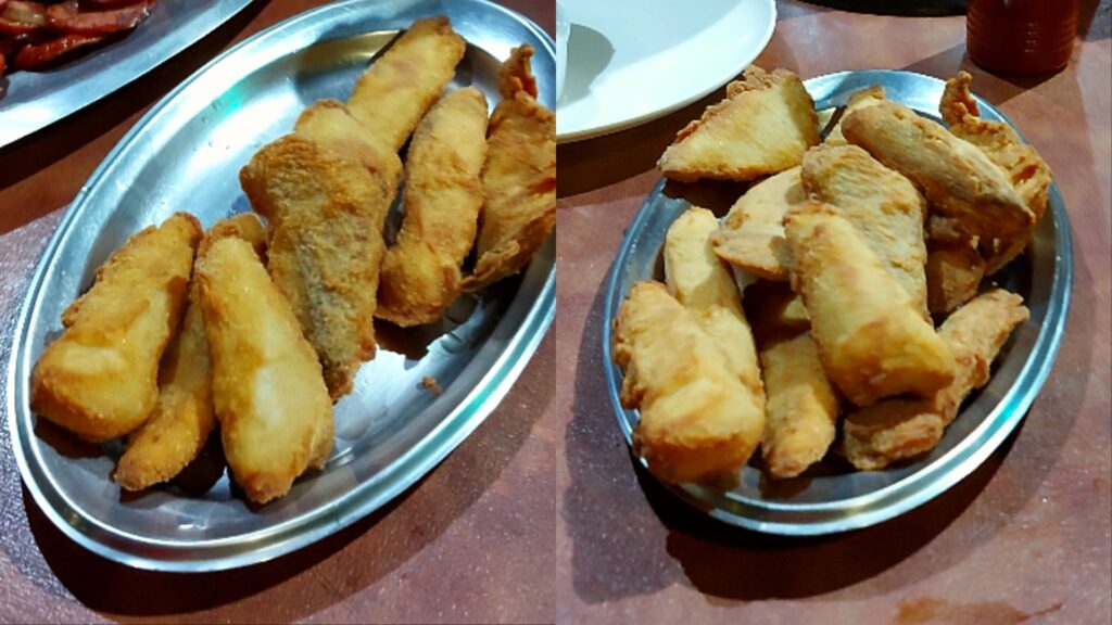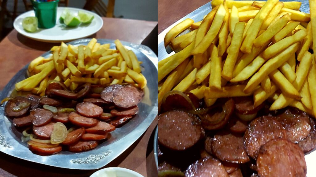 As porções clássicas, como torresmo, pastelzinho frito, coxinha ou até mesmo costelinha de porco não estavam presentes. Com isso, fomos no que tinha: batata, peixe e calabresa frita.