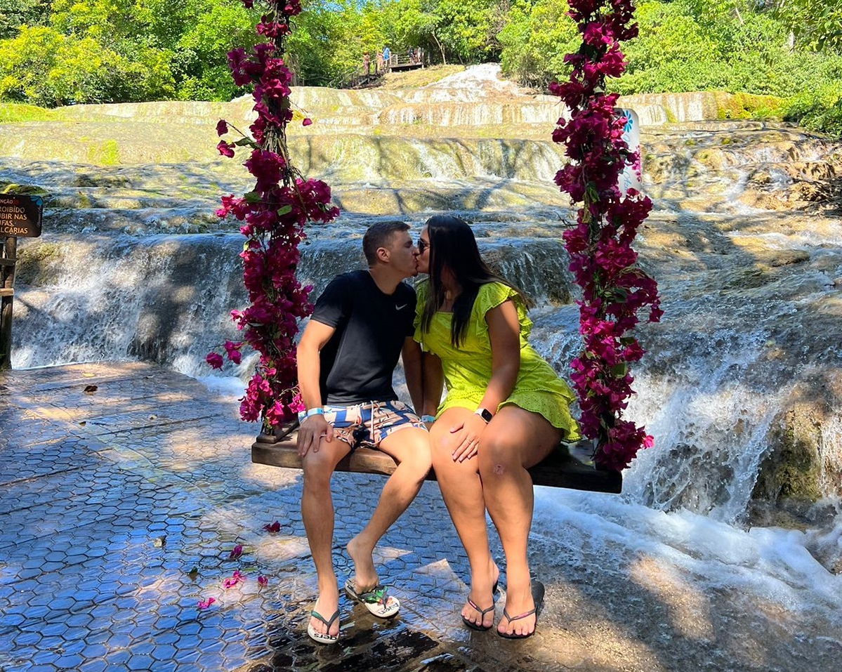 Beatriz e Linyker Alves da Cunha, de 29 anos, ficaram noivos neste domingo (30). Ao Jornal Midiamax, a pedagoga explica que o relacionamento amoroso começou há um ano, quando ambos foram com os amigos ao Carnaval de Bonito e ficaram na festa realizada em 2022. Dessa vez, eles voltaram à região turística sozinhos num passeio mais intimista. Até então, ela sequer imaginava os planos de Linyker.