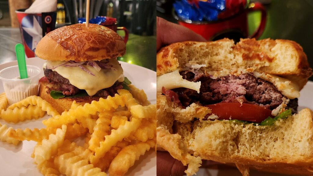 Além de hot dog, o local oferece burguers, que também têm nome de super-heróis. Todo dia um deles entra na promoção, no combo com porção de batata frita por R$ 29,90, então, aproveitamos e provamos o do dia, o burguer Homem-Aranha.