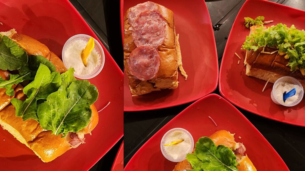 Com nome de super-heróis, os lanches diferenciados, chamados no cardápio de hot dog gourmet, oferecem opções com salaminho, rúcula, repolho, cebola roxa e couve… será que é bom? Por R$ 16 cada, decidimos então provar o “Viúva Negra“, que tem como diferencial a rúcula fresquinha e bacon, e o hot dog “Thor“, que vem com delicioso salaminho e cebola roxa.