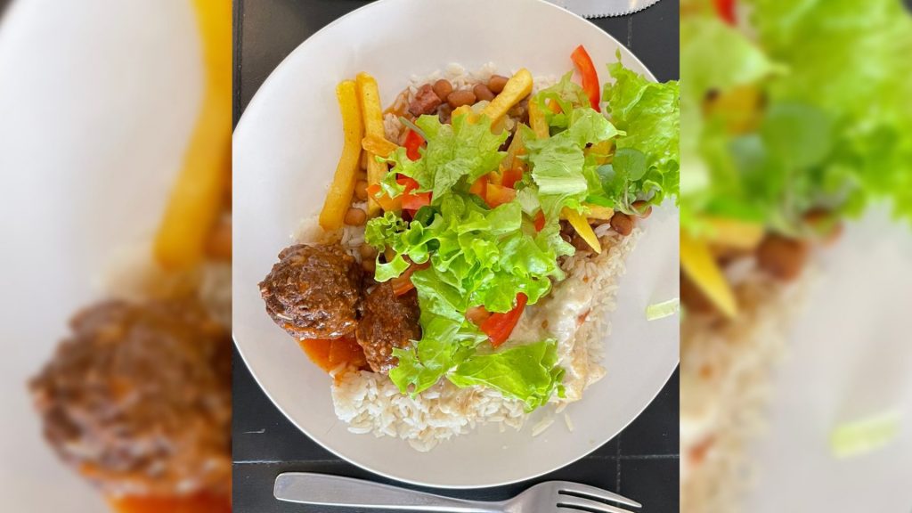 De volta na mesa, provei a comida. Arroz soltinho saboroso, almôndegas muito bem temperadas, batata-frita crocante e sem exagero no sal e frango ao molho muito bom também. E a salada? É aí que veio a surpresa desagradável: o tomate estava passado, situação que foi comprovada por três pessoas diferentes, que estavam na mesma mesa. Porém, ao pegar mais um pouco de tomate, já senti o cheiro e aí perguntei para as outras pessoas.