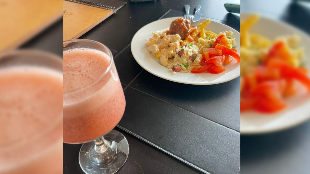 Verificando o cardápio, optei por um suco de laranja, de 900 ml. No entanto, no dia que estive no local, disseram que não tinha e falaram alguns sabores de polpas disponíveis. O suco pedido foi o de morango, bem saboroso por sinal. Hora de levantar e ir até a ilha se servir. O cardápio do dia era arroz branco ou arroz com bacon, feijão também com bacon, batata-frita, almôndegas, frango ao molho branco e algumas opções de saladas, como pepino, tomate e alface.