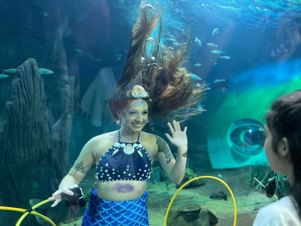“Foi uma experiência completamente diferente e mágica! Eu estou acostumada a estar nos bastidores, cuidando dos tanques e garantindo que tudo esteja em perfeito estado para os animais e para o público. Surgir como sereia, com todos os olhos voltados para mim, foi emocionante. Ver as reações das pessoas, especialmente das crianças, foi algo muito especial, que me fez sentir parte de um mundo encantado”, diz a mergulhadora ao Jornal Midiamax.