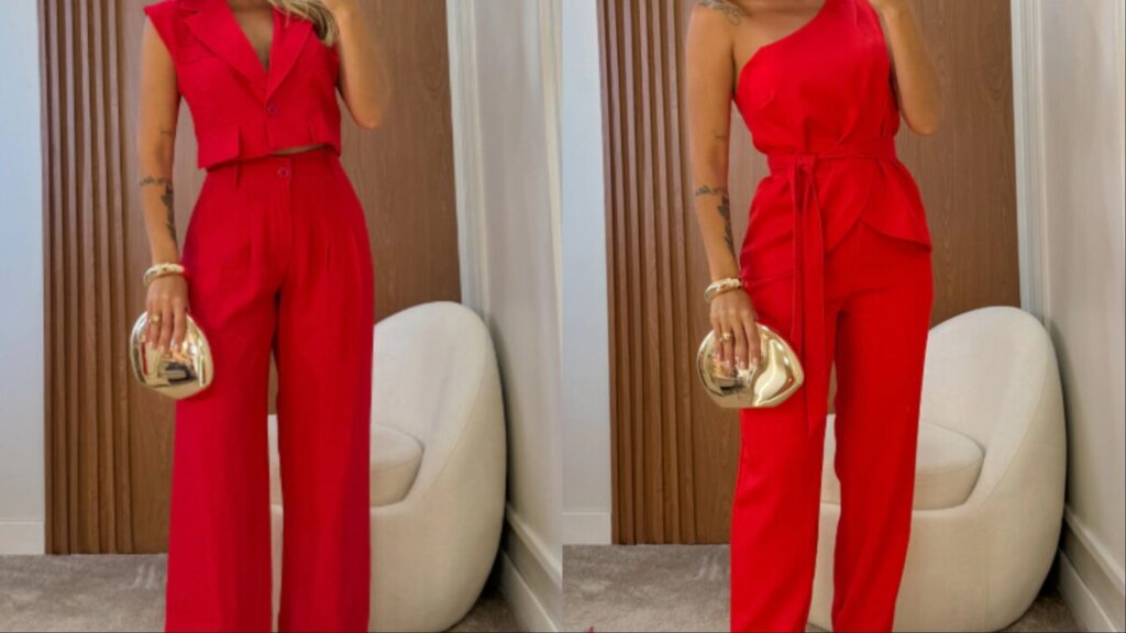 Para aquelas que preferem um “look” mais formal, o conjunto Célia, é de estilo alfaiataria minimalista, com um colete estruturado sem mangas e uma calça de cintura alta, as numerações vão do 36 a 42, por R$ 179,99.