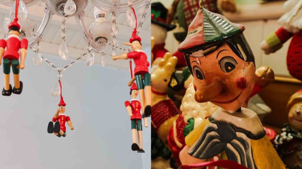 Entre os enfeites, os Pinóquios chamam atenção pendurados nos lustres da casa. Esses, além de combinarem com o tema festivo, têm um motivo especial para estarem ali.