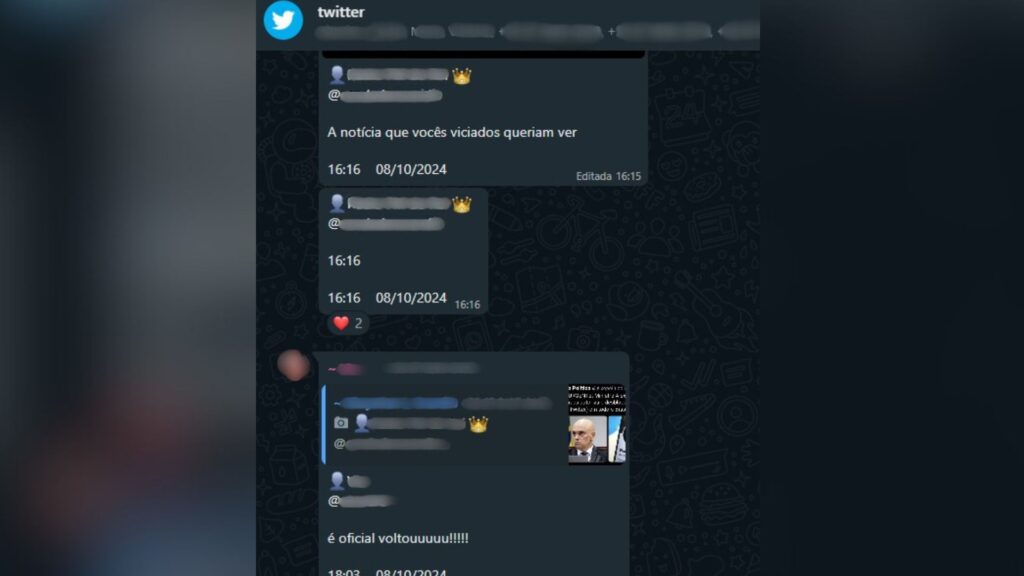 A falta da rede social foi tanta que até mesmo uma amiga de Helder resolveu criar um grupo no WhatsApp que tivesse a mesma função do X. Assim, os integrantes do grupo podiam mandar ‘tweets’. Helder chegou a usar duas vezes a invenção da amiga.