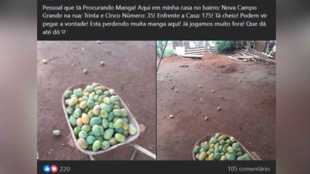 “Eu estava aqui sentado, e vi que o vento tinha jogado várias no chão. Tive, então, essa ideia de publicar no grupo do bairro no Facebook. Deu muito certo, vieram umas 10 pessoas para buscar. O último que veio levou o carrinho cheio de mangas e falou que a família dele, que é grande, deve comer tudo hoje mesmo”, contou.