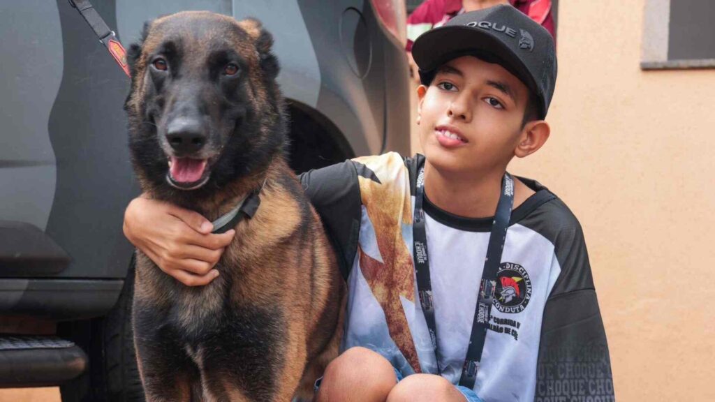 Um convidado especial também compareceu à festinha para alegrar os convidados: um “cão policial” do Batalhão de Choque. O cachorro garantiu a felicidade de Júlio e de outros presentes.
