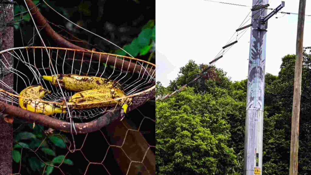 Além disso, ao final da passarela, já próximo à calçada, uma cesta com bananas mostra que pessoas da região costumam alimentar os animaizinhos.