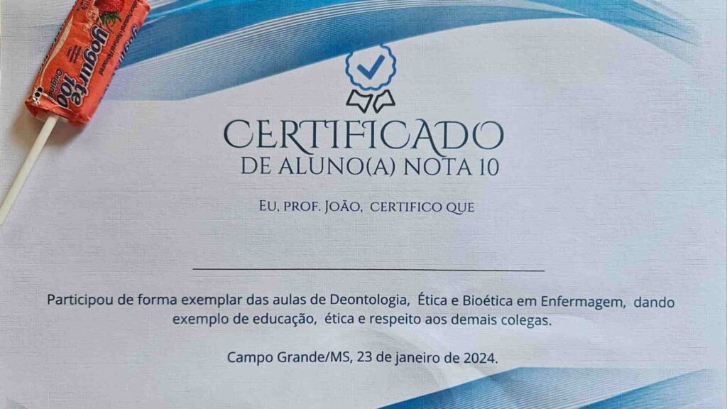 Há alguns dias, quando finalizou as aulas de deodontologia para os cursos de técnico em enfermagem, percebeu a dedicação de dois “mini alunos” e decidiu fazer a premiação de ‘Aluno Nota 10’. “Eles receberam certificado e um pequeno doce como forma de gratidão por terem participado das aulas. É o mínimo que qualquer professor deveria fazer, tornar o mais confortável a estadia deles em nossas salas de aula, afinal, ainda que com suas mães, estão entre adultos, em um ambiente estranho, ouvindo por horas assuntos dos quais possivelmente não estão compreendendo quase nada”, explicou.