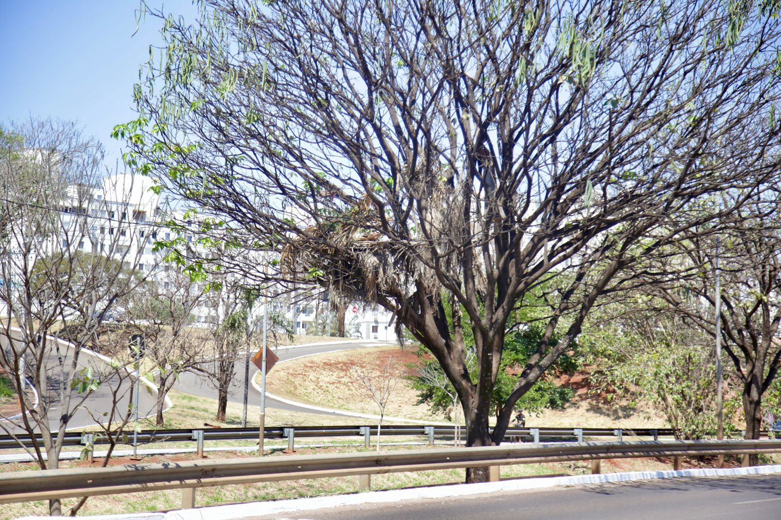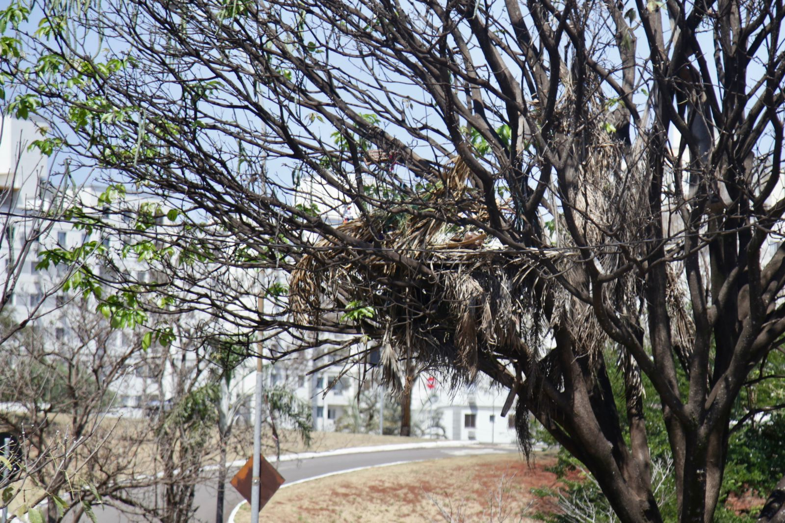 No meio da Avenida Ernesto Geisel, em frente a um condomínio de prédios, uma modesta cabana no alto de uma árvore chama atenção dos motoristas em Campo Grande (MS).