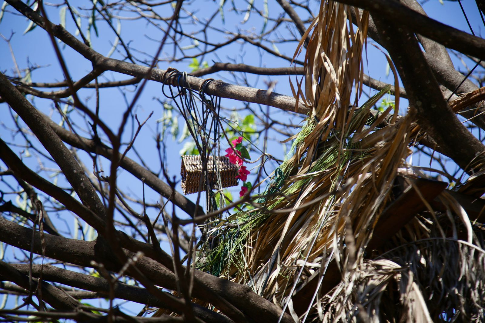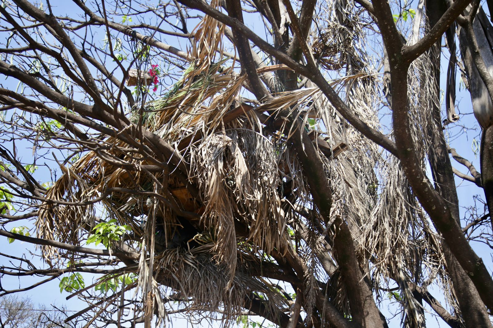 O cuidado, no entanto, chama atenção, pois o barraco é diferente dos habituais encontrados pela Capital. Levantado em cima de uma árvore com estrutura de palets amarradas sobre os galhos, a cabana é suspensa e conta com um “teto” de folhas ressecadas de palmeiras.