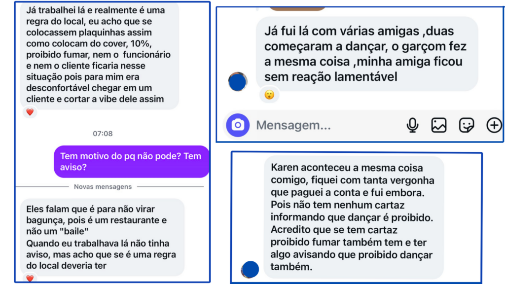 À Karen, o funcionário teria dito: “Moça, desculpa, não pode dançar”. Ela questionou o porquê e completou: “Mas é uma música dançante”. Em seguida, ele rebateu: “É porque aqui é um restaurante”, narrou Karen.