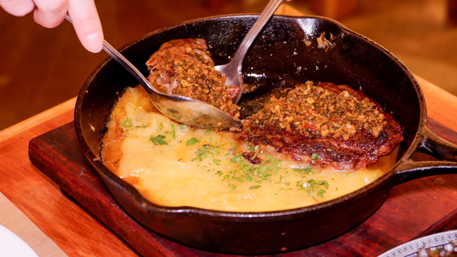 No caso da finalização, é que chega o chimichurri de tereré. “É uma erva que precisa ser mais selecionada, porque tem muito galhinho, então, eu uso uma da melhor qualidade e misturo com ervas desidratadas, como salvia, salsinha, cebolinha e pimentão vermelho, que são hidratadas com vinho branco, azeite de oliva e vinagre de vinho, além do sal e pimenta-do-reino também, então, fica marinando alguns dias antes da utilização”, explicou.