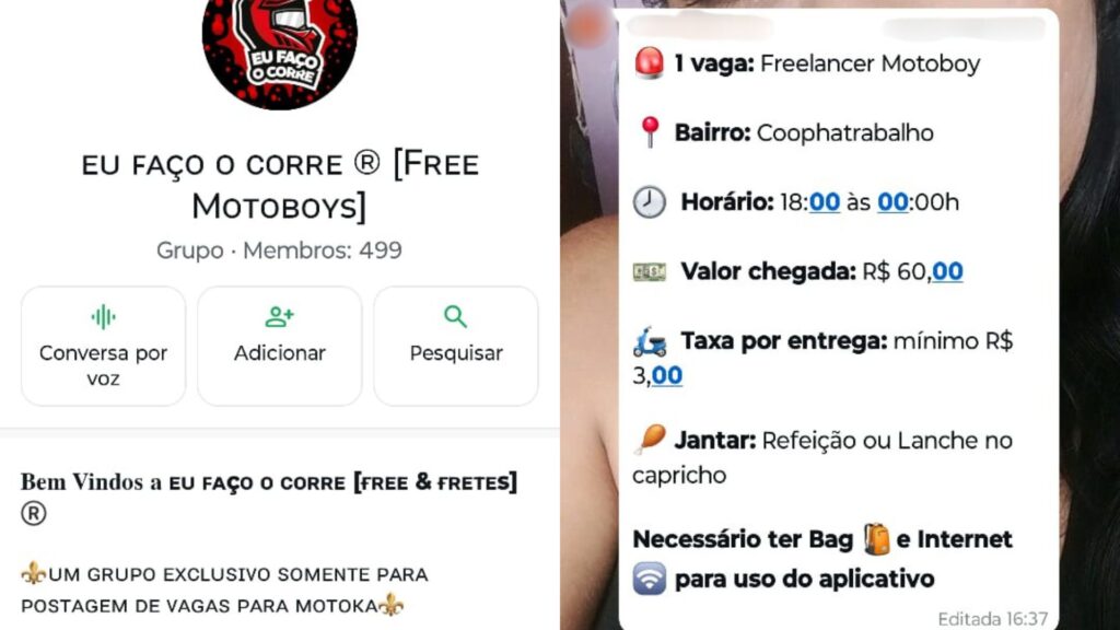 “Participo de vários grupos de motoentregadores, onde o propósito são ofertas de vagas para free, frete e fixo. Nos grupos participam motoboys e motogirls, assim como empresários da capital, que oferecem suas ofertas de vagas. O mais conhecido e organizado se chama ‘Eu faço o corre’, um grupo formado apenas para vagas”, explica.