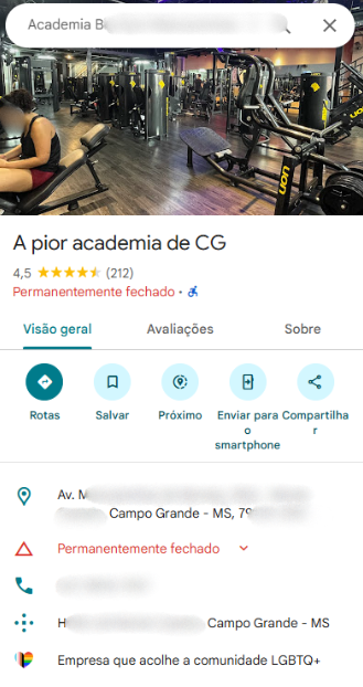 No mesmo dia em que uma academia de Campo Grande (MS) virou notícia por “sumir do mapa” e deixar os clientes “a verem navios”, outra unidade da mesma rede foi vítima de ataque hacker em página do Google.