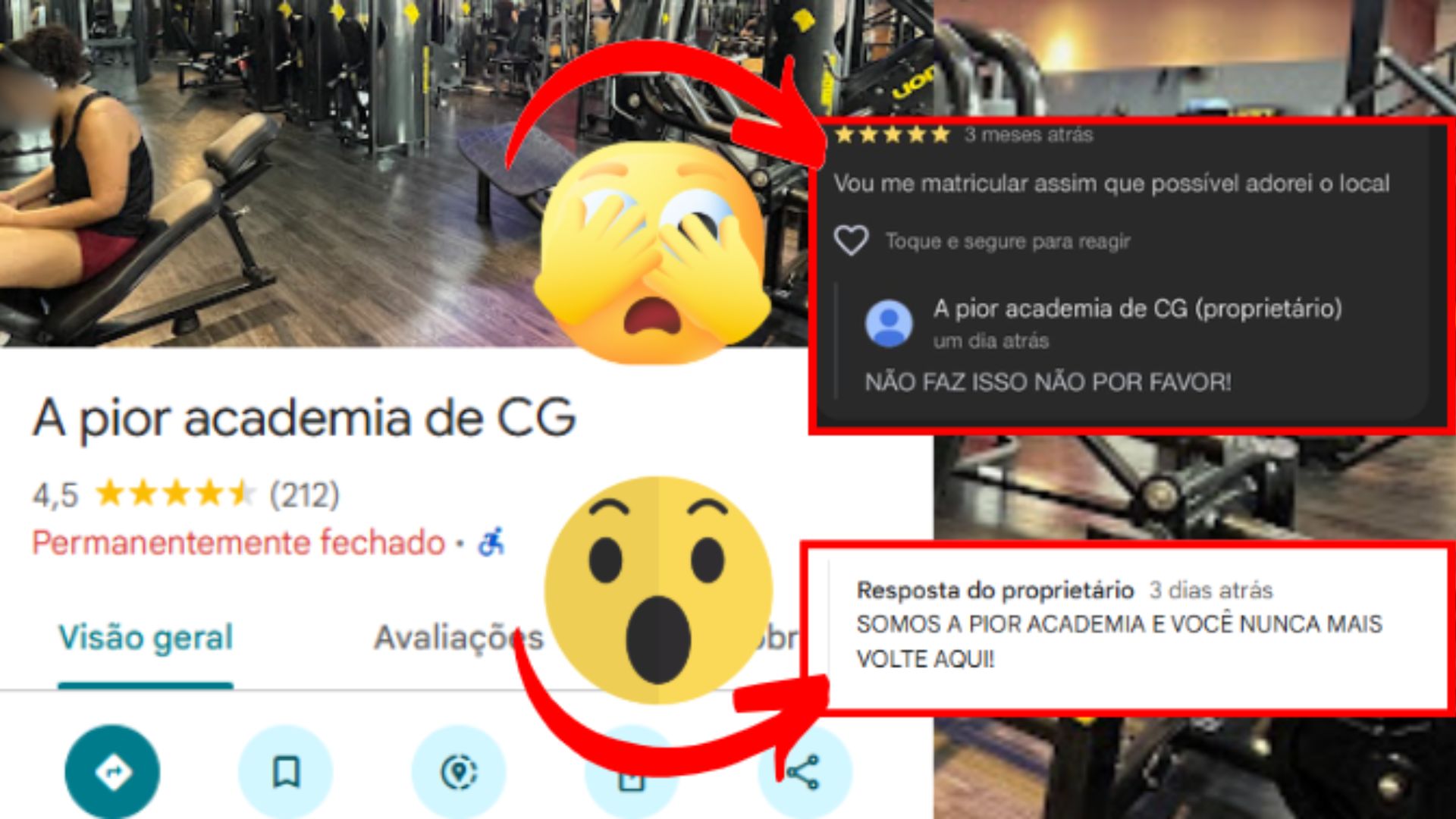 Esta semana, o perfil do estabelecimento foi invadido por algum engraçadinho que decidiu renomear a conta para “A pior academia de CG”. Como se não bastasse, o responsável pela ação ainda saiu respondendo a avaliações na plataforma.