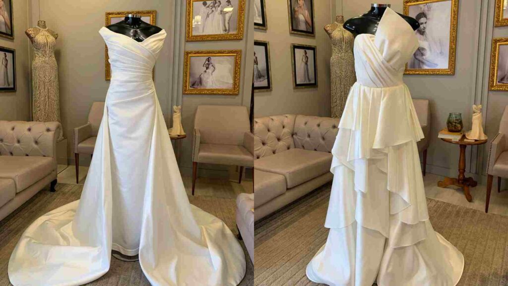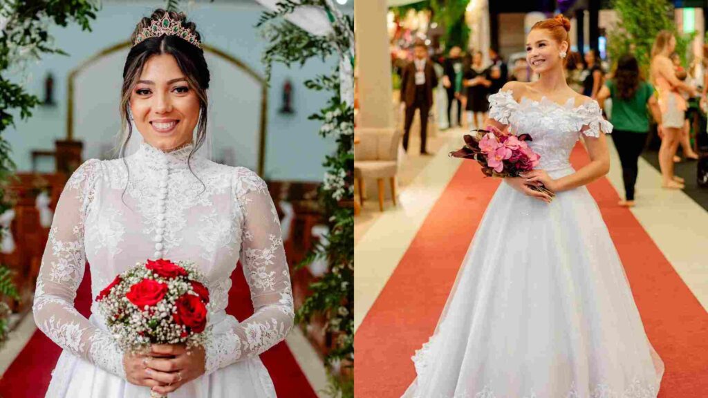“Seu vestido é em gola americana, uma escolha atemporal. Aqui nossas não optam muito pela gola, até mesmo pelo nosso clima, porém os detalhes sobrepostos na gola dando efeitos de 3D é tendência nos vestidos de noiva de 2025 e 2026”, explica.
