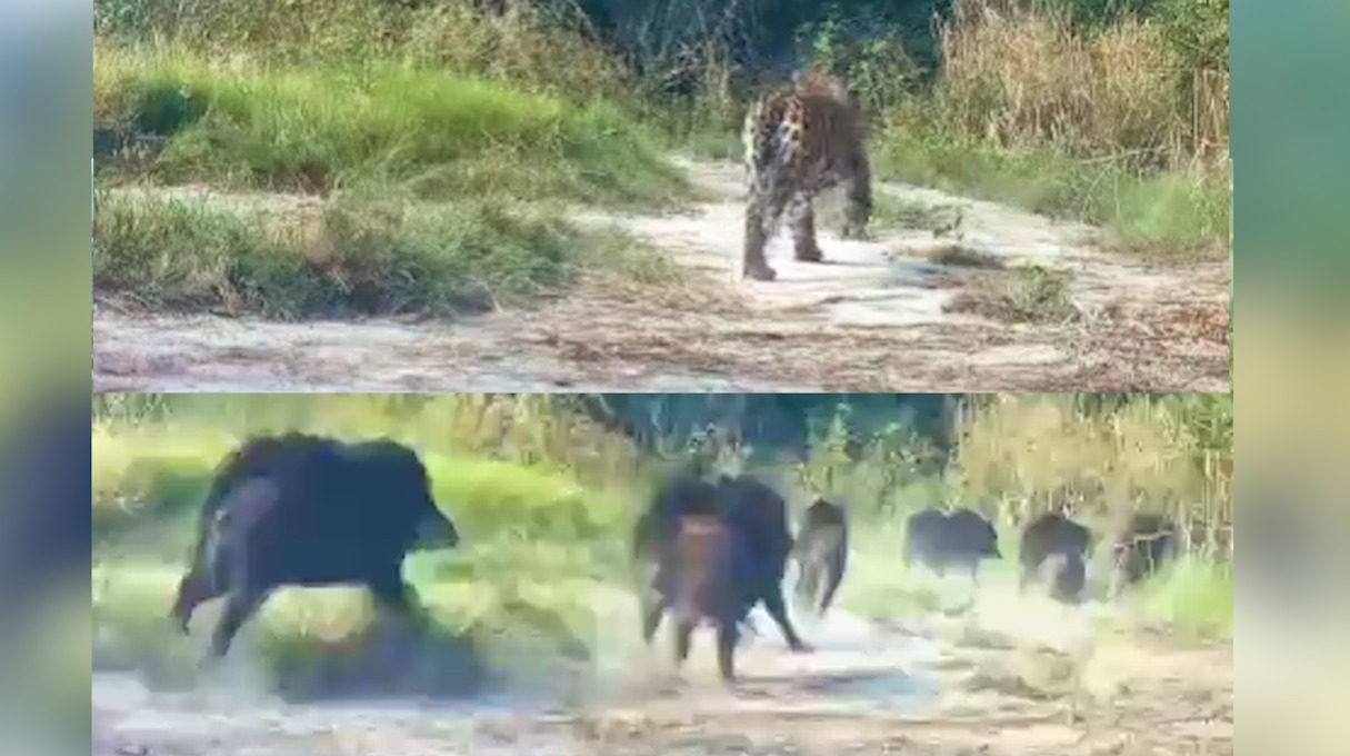 Câmeras de monitoramento do IHP (Instituto Homem Pantaneiro) flagram o momento em que um grupo de queixadas passou a perseguir a onça-pintada Acuri, macho que frequenta a área da RPPN (Reserva Particular do Patrimônio Natural) Acurizal, no Pantanal sul-mato-grossense.