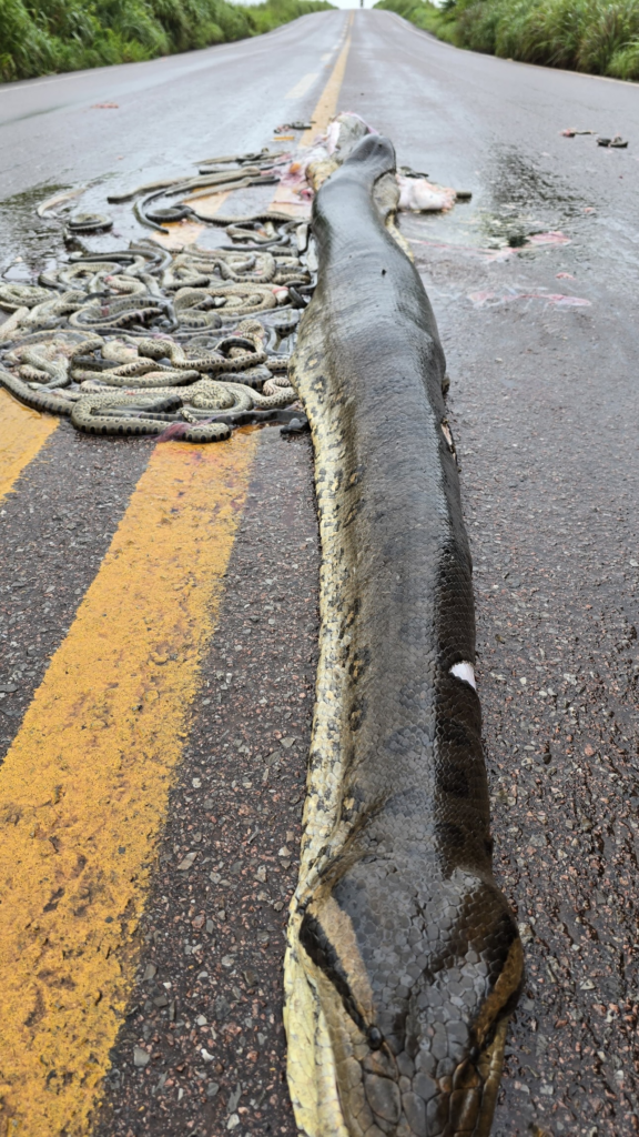 Isso porque uma gigante sucuri grávida foi encontrada morta nesta segunda-feira (6) em uma rodovia brasileira. A serpente teria sido vítima de atropelamento e, com o impacto do acidente, os filhotes que ainda estavam em fase de formação acabaram expelidos de seu ventre e também não resistiram, morrendo no local.