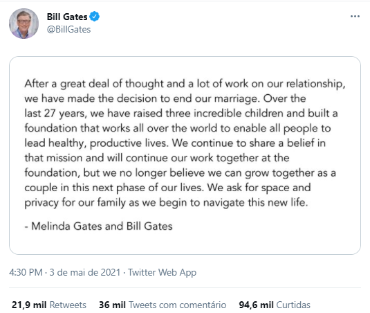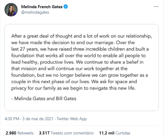 Bill Gates e Melinda French Gates anunciaram a separação nesta segunda-feira (3) após 27 anos de união. O anúncio foi feito na tarde de hoje em um comunicado divulgado nas redes sociais.