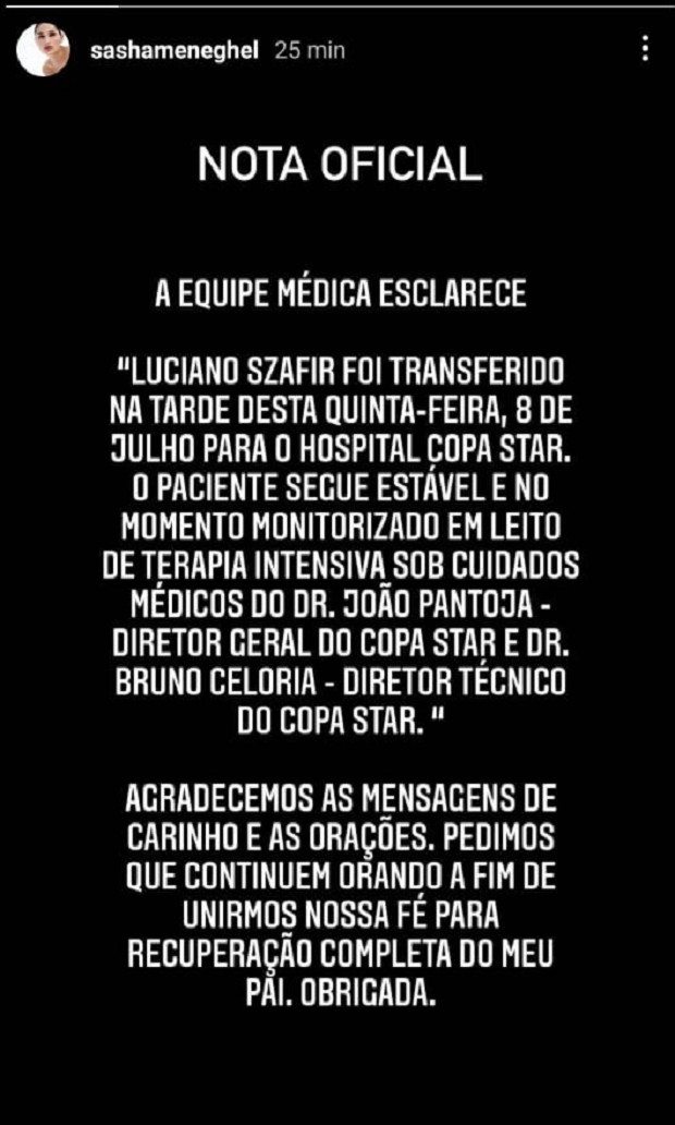 Já o comunicado informa que “Luciano Szafir foi transferido na tarde desta quinta-feira, 8 de julho para o hospital Copa Star. O paciente segue ESTÁVEL e no momento monitorizado em leito de terapia intensiva sob cuidados médicos do Dr. João Pantoja – Diretor Geral do Copa Star e Dr. Bruno Celoria – Diretor Técnico do Copa Star”.