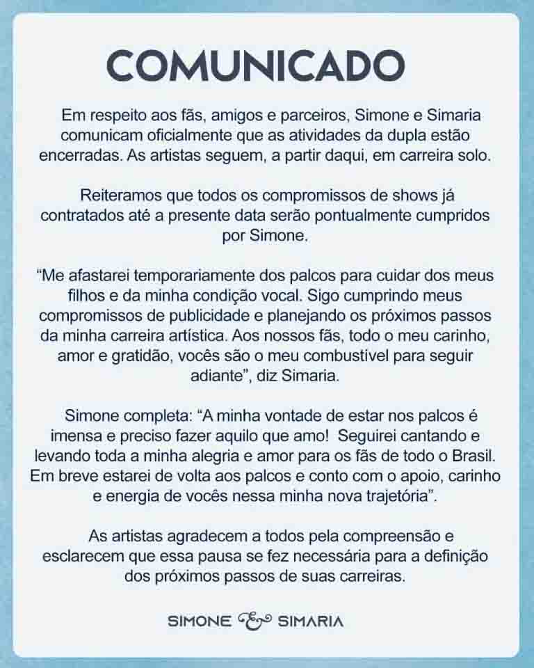 A dupla Simone e Simaria anunciaram o fim da parceria em comunicado enviado pela assessoria na noite desta quinta-feira (18). Agora, ambas seguem em carreiras solo.