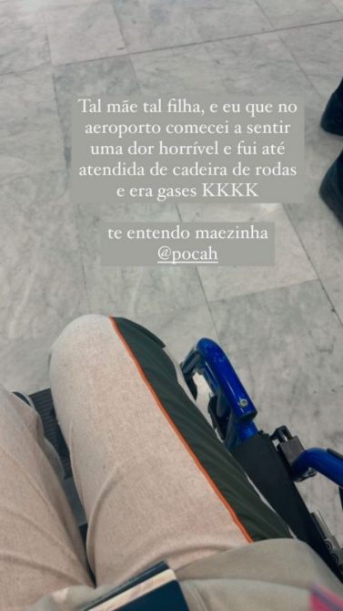 “Tal mãe, tal filha. E eu que no aeroporto comecei a sentir uma dor horrível e fui até atendida de cadeira de rodas e eram gases (risos). Te entendo, mãezinha Pocah“, brincou. Pocah repostou o story de Viih. “Melhoras, minha filha! Peido é coisa séria!”, postou a cantora.