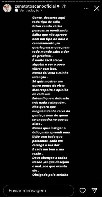 “Gente, descarto aqui todo tipo de ódio. Estou vendo várias pessoas se revoltando. Saiba que não aprovo nem um tipo de ódio e cancelamento. Só queria passar que nem todo mundo sabe a dor do próximo. É muito fácil atacar alguém e ver o povo vibrar com isso. Nunca foi essa a minha intenção. Só quis mostrar um ponto de vista. Mas respeito a opinião de cada um. Entendi que o ódio não traz nada a ninguém. Não quero que ninguém tenha raiva da gente, e nem de quem se enquadra no que eu disse. Nunca quis incitar o ódio, mas aprendi uma lição com tudo que passados. Cada um carrega a sua dor e cada um tem a sua razão. Deus abençoe a todos. Desde os que desejam o mal até quem exausta ele. Obrigado pelo carinho”, escreveu ele.