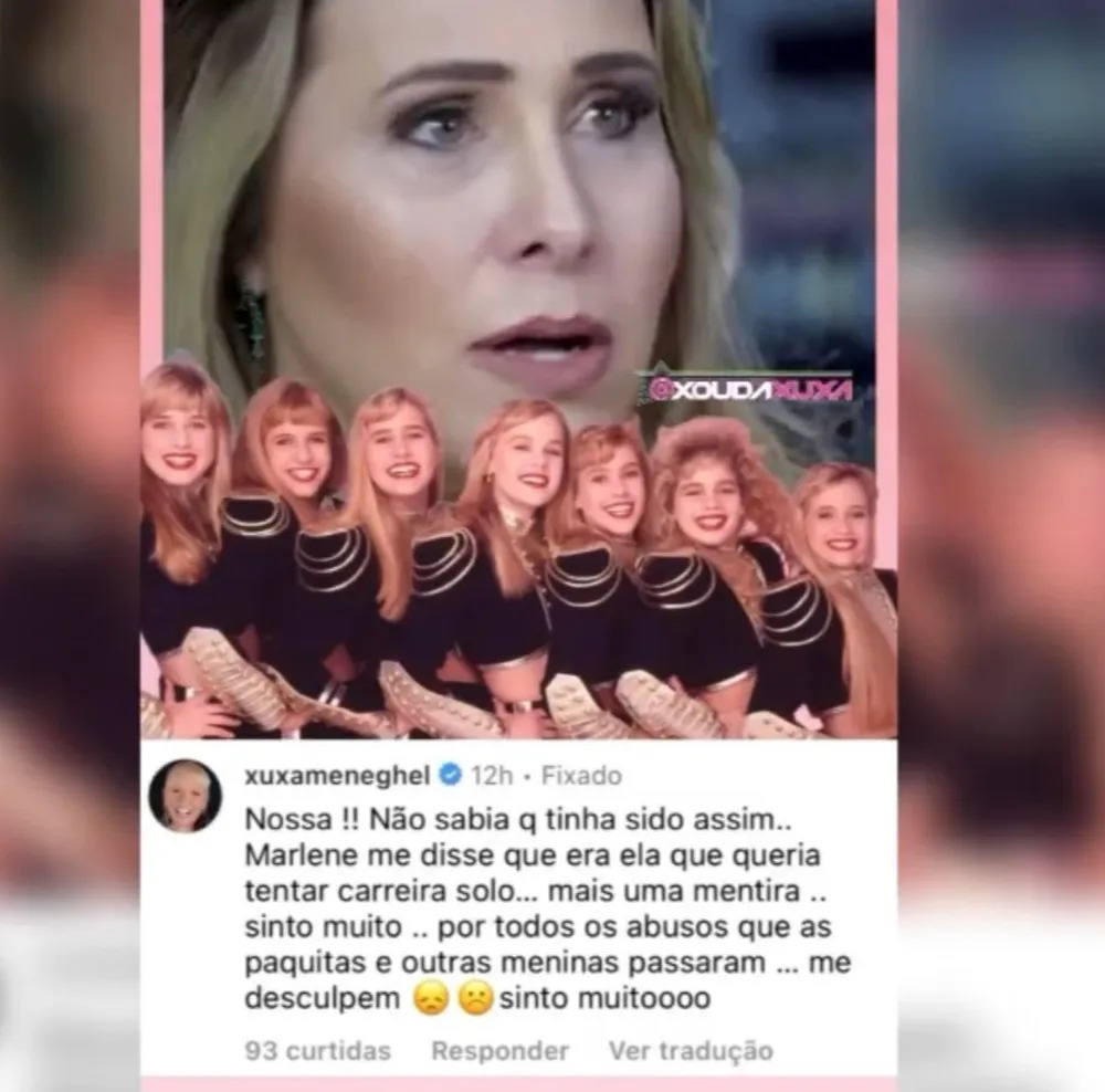 “Não sabia que tinha sido assim. Marlene me disse que era por que [você] queria tentar carreira solo. Mais uma mentira. Sinto muito por todos os absurdos que as paquitas e outras meninas passaram. Me desculpem, sinto muito”, lamentou Xuxa. Será que agora elas fazem as pazes?