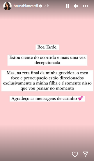 No comunicado, ela informou estar ciente do ocorrido, mas que neste momento quer apenas se dedicar à filha. “Boa tarde, estou ciente do ocorrido e mais uma vez decepcionada. Mas, na reta final da minha gravidez, o meu foco e preocupação estão direcionados exclusivamente à minha filha e é somente nisso que vou pensar no momento. Agradeço as mensagens de carinho”, escreveu Bruna no story.