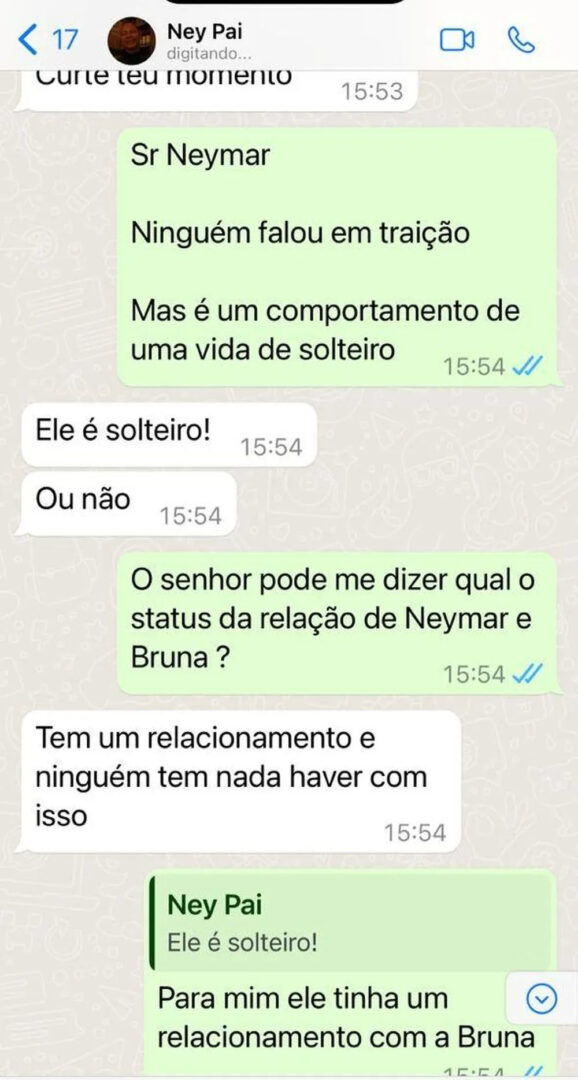 Neymar, pai do jogador, afirmou que as imagens não mostram nada de mais, já que, enquanto morou na Espanha, o filho fez várias amizades. No entanto, prints divulgados por Léo Dias, em conversa com o pai do jogador, dão a entender que talvez Neymar esteja solteiro.