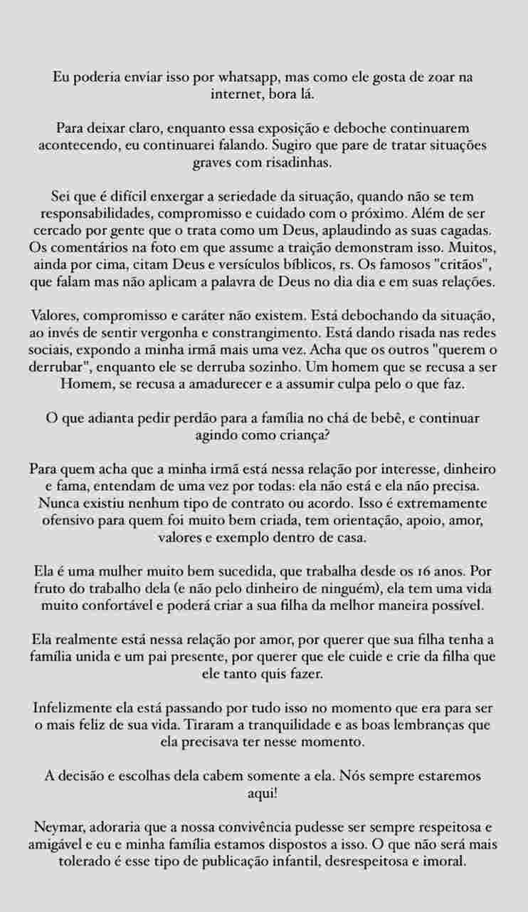 O que adianta pedir perdão para a família no chá de bebê, e continuar agindo como criança? Para quem acha que a minha irmã está nessa relação por interesse, dinheiro e fama, entendam de uma vez por todas: ela não está e ela não precisa. Nunca existiu nenhum tipo de contrato ou acordo. Isso é extremamente ofensivo para quem foi muito bem criada, tem orientação, apoio, amor, valores e exemplo dentro de casa”.