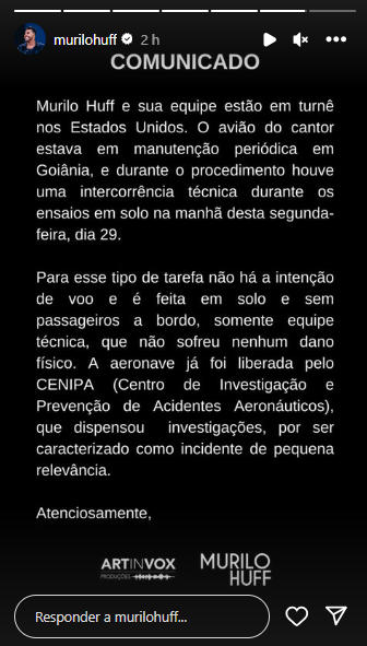 Murilo Huff usou suas redes sociais para tranquilizar os fãs, após a notícia. Ele reafirmou que está em turnê nos Estados Unidos e que ninguém da sua equipe estava a bordo no momento do incidente. “