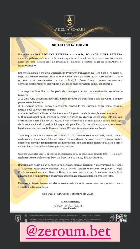 Após a veiculação da matéria, a defesa de Deolane Bezerra esclareceu a abertura da empresa. “A mãe de Deolane Bezerra não é, e nunca foi, parte da administração dessa empresa. O capital social de R$ 30 milhões declarado na abertura da empresa está em total conformidade com a Lei nº.14.790/2023. […] Atualmente, a empresa atua legalmente com licença de Curaçao, como 99% das bets que atuam no Brasil”, declarou.