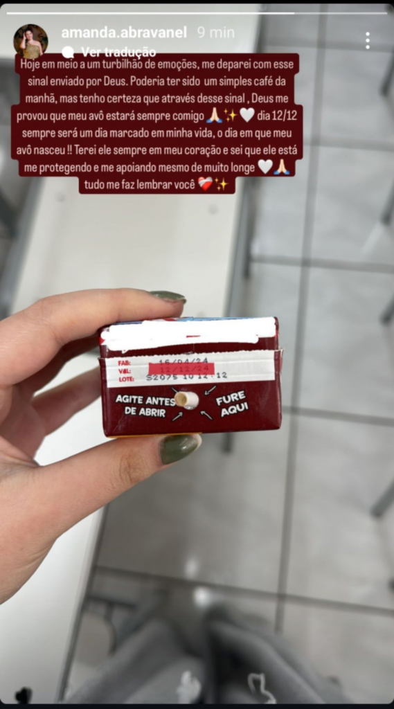 “Hoje em meio a um turbilhão de emoções, me deparei com esse sinal enviado por Deus. Poderia ter sido um simples café da manhã, mas tenho certeza que através desse sinal, Deus me provou que meu avô estará sempre comigo. Dia 12/12 sempre será marcado em minha vida, o dia que meu avô nasceu”, começou ela.