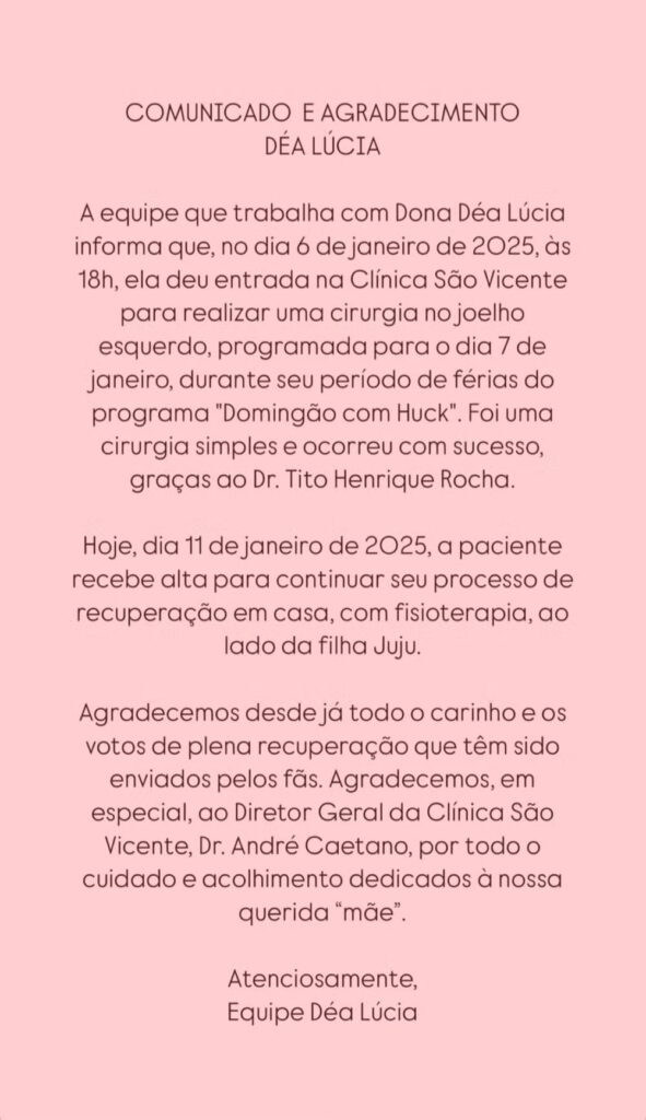 “A paciente recebe alta para continuar seu processo de recuperação em casa, com fisioterapia, ao lado da filha Juju”, completou o comunicado.