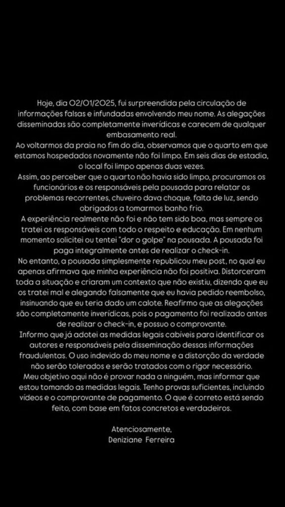 Por fim, a ex-BBB negou as acusações e fez novas críticas à pousada. De acordo com ela, os quartos não eram limpos, chuveiro dava choque e ainda faltava energia. Contudo, a influenciadora nega que tenha feito solicitação de reembolso. “A experiência realmente não foi e não tem sido boa, mas sempre tratei os responsáveis com todo o respeito e educação. Em nenhum momento solicitei [reembolso] ou tentei ‘dar o golpe'”, completou ela, que garantiu que tomará as medidas cabíveis.