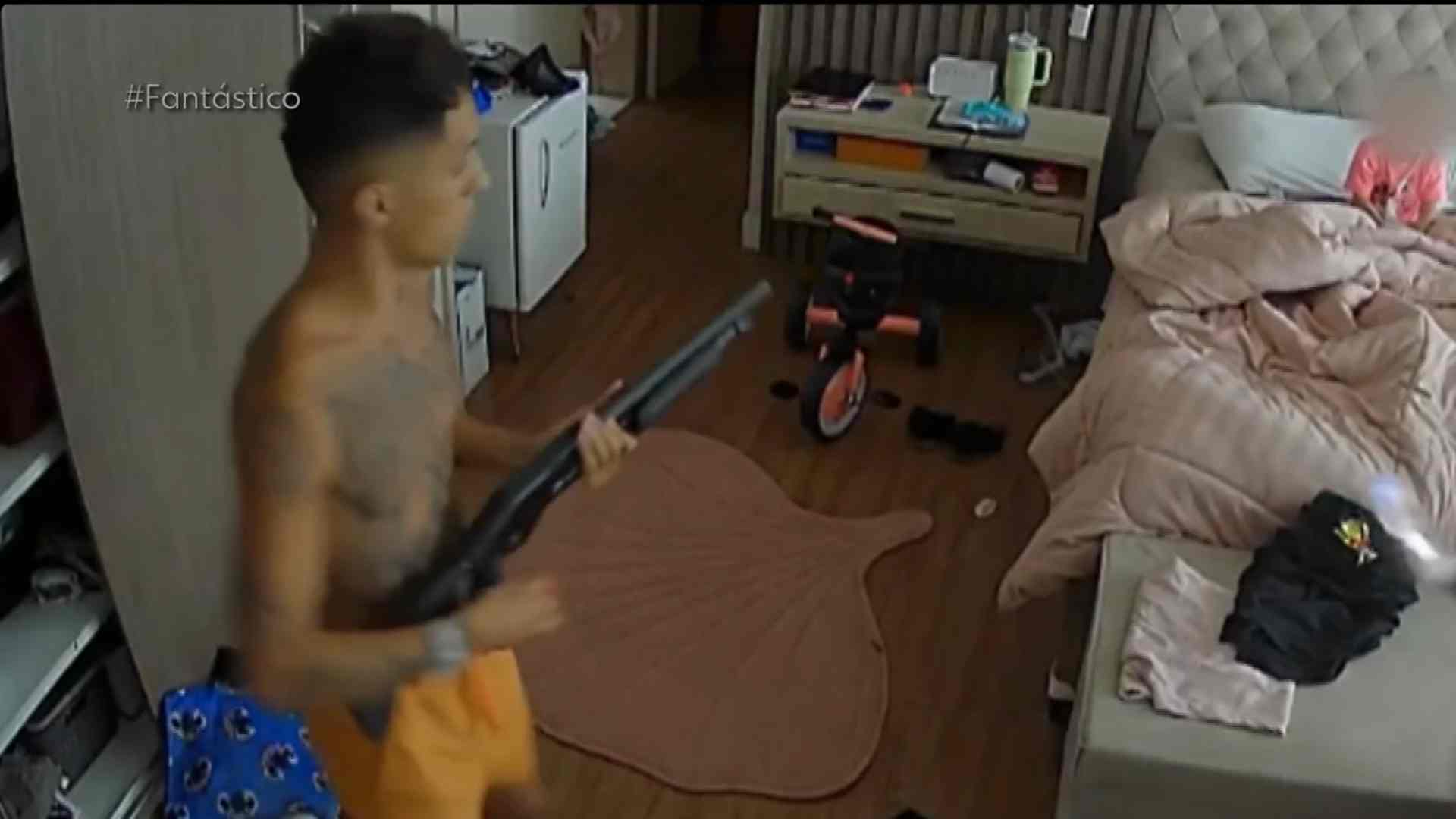 Na sequência, ele volta a pegar a arma e deixa o cômodo. Por fim, poucos minutos depois, ele retorna ao quarto já sem a espingarda e sem o celular. Toda a situação durou seis minutos.