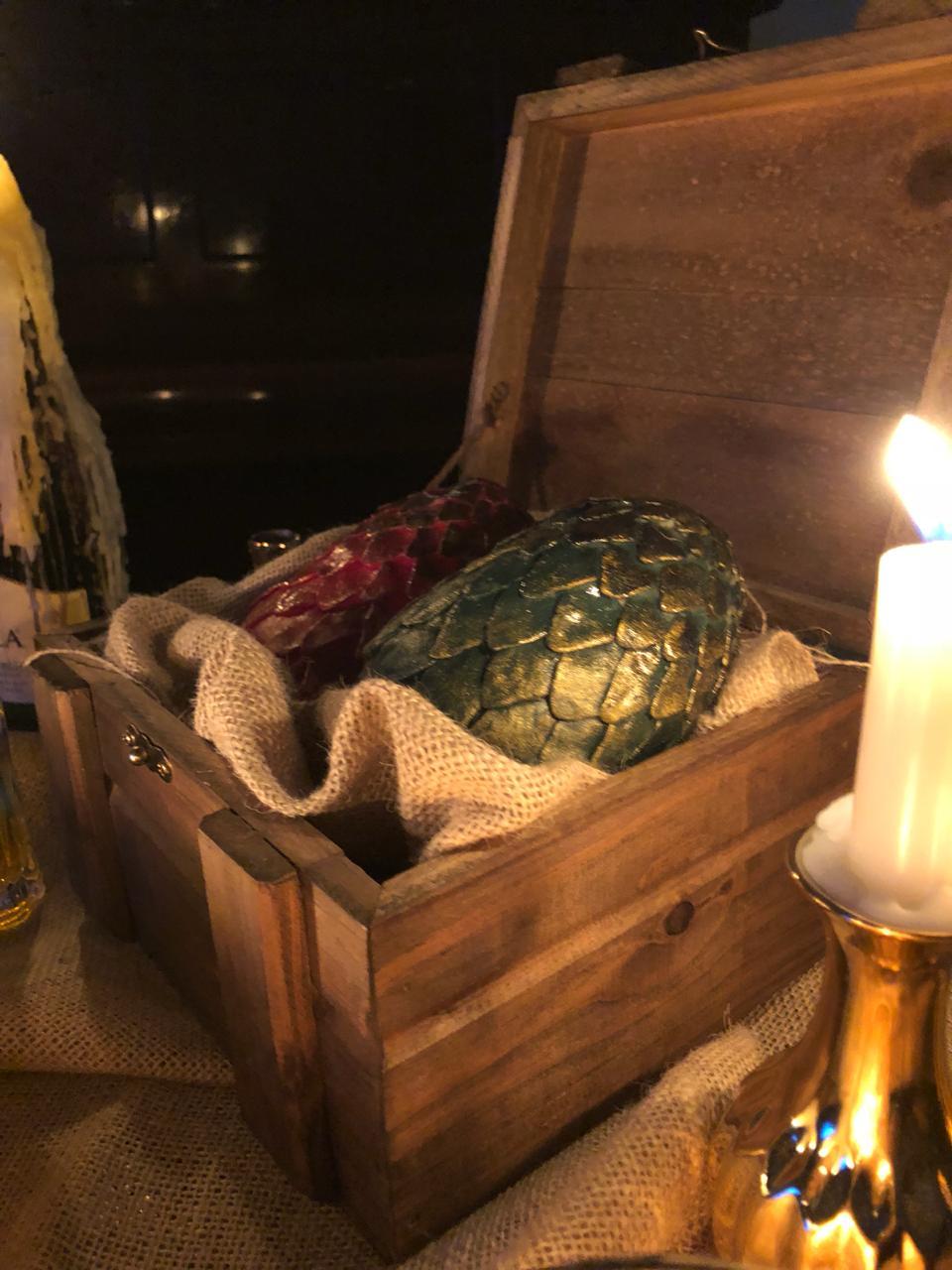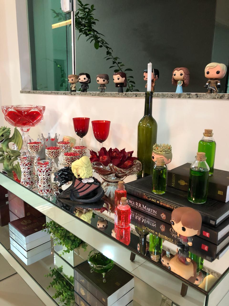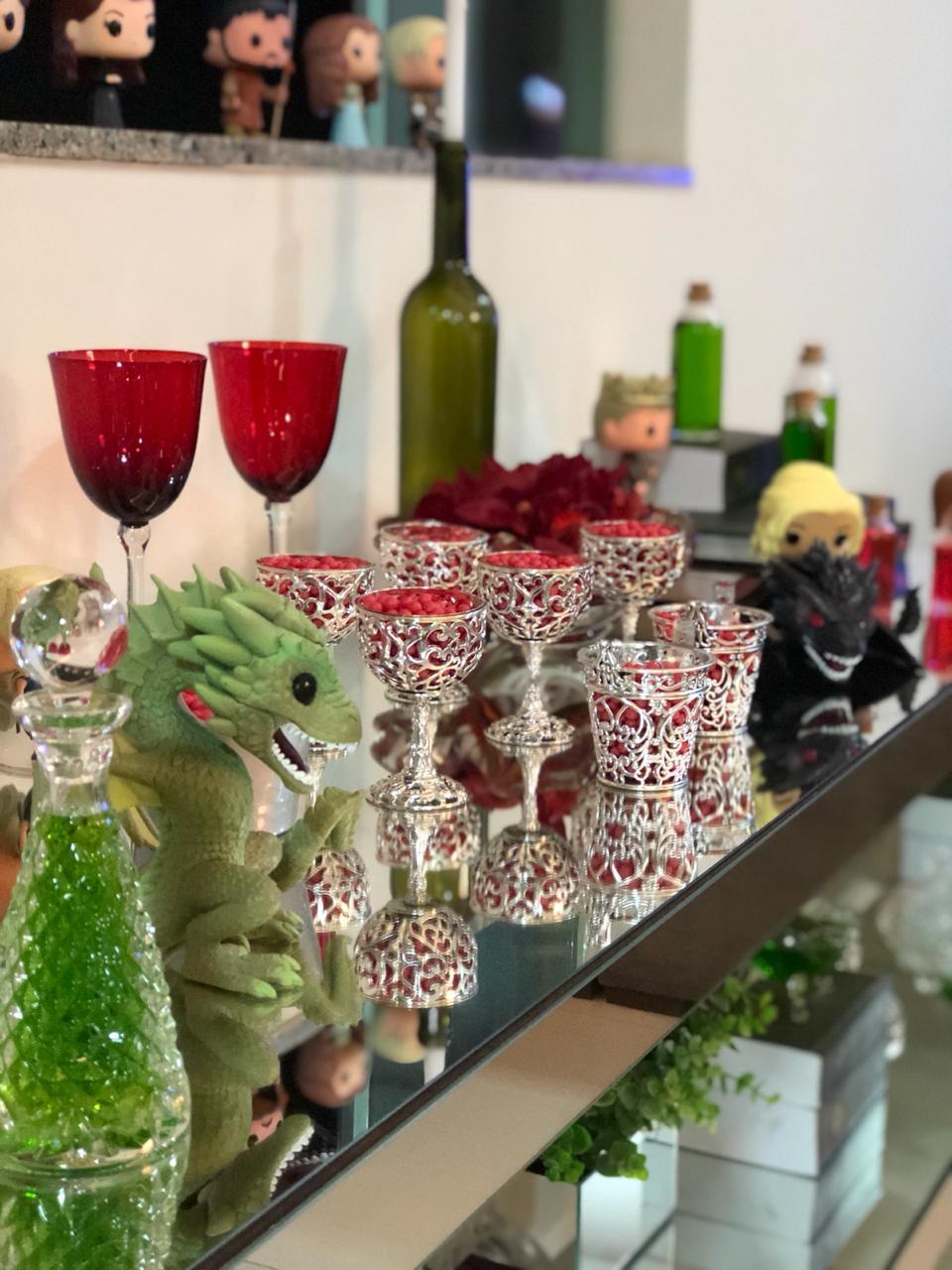 No início da última temporada neste ano, o grupo fez uma reunião com direito a dois ovos de dragão, funkos de vários personagens da série, inclusive dos dragões de Daenerys, velas e taças. “É uma mistureba, de objetos da série mesmo e outras coisas que remetem à Idade média”, conta Gabriel. Para o fim deste domingo, a preparação é de um jantar medieval com taças personalizadas para a Season Finale.