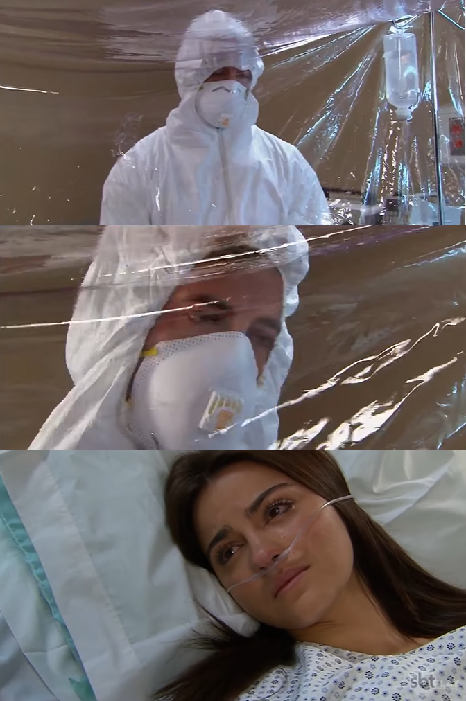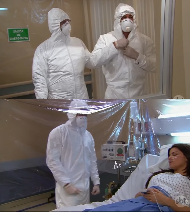 A entrada no ambiente só é permitida com trajes específicos de extrema proteção, e é claro, com as máscaras faciais – hoje absolutamente comuns em qualquer lugar no mundo. Retratadas na novela, as cenas impressionam pela semelhança com o cenário imposto pelo coronavírus no planeta.