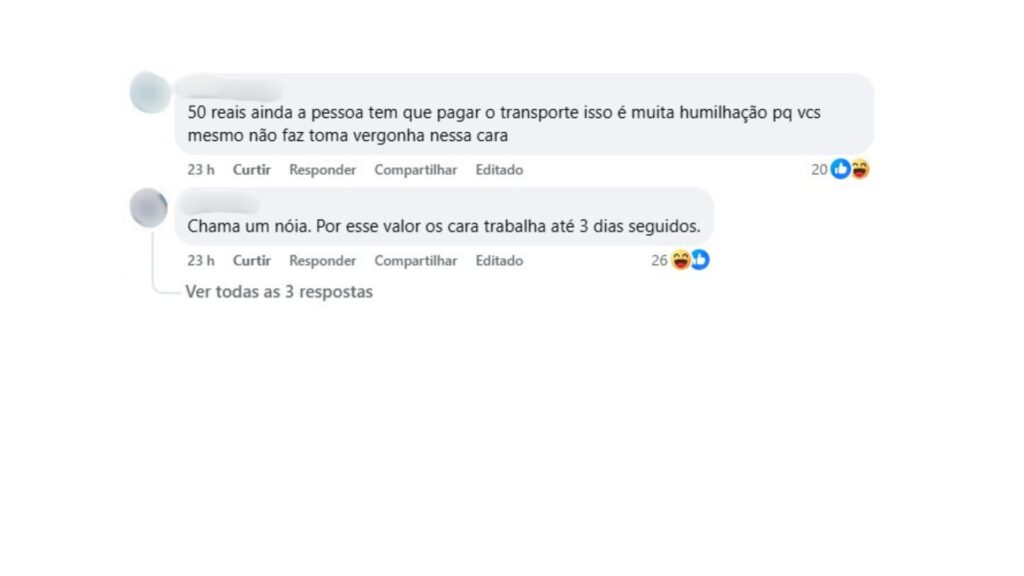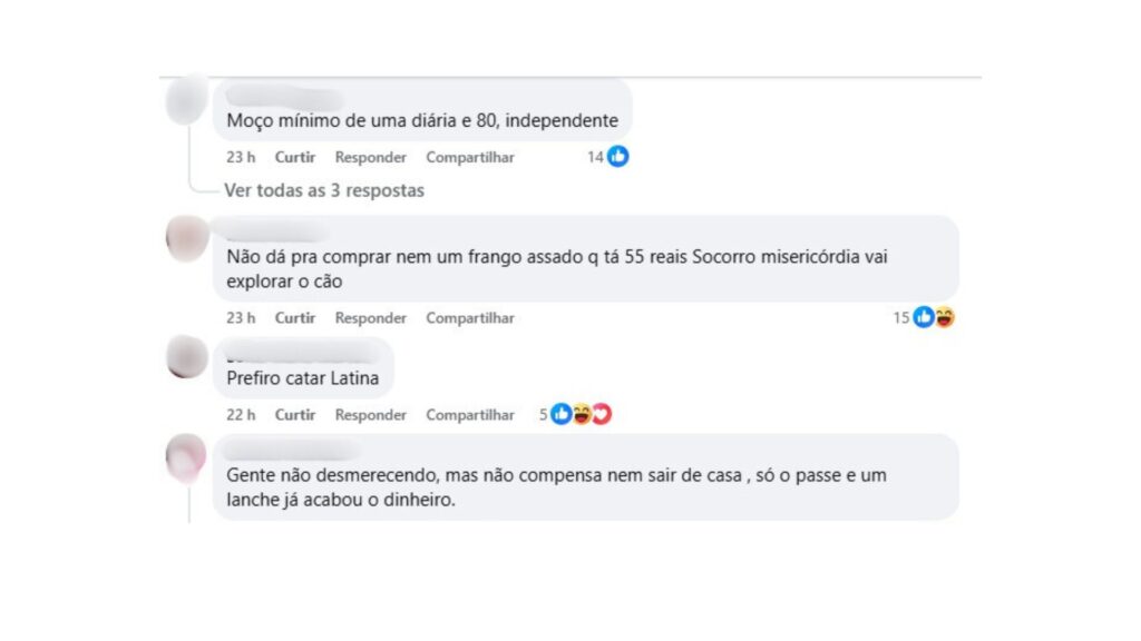 O público se revoltou contra a oferta e afirmou que o dinheiro mal cobre o suficiente para o deslocamento e um lanche. Comentários como “prefiro catar latinha” e “não compensa nem sair de casa” foram algumas das respostas ao post. Confira: