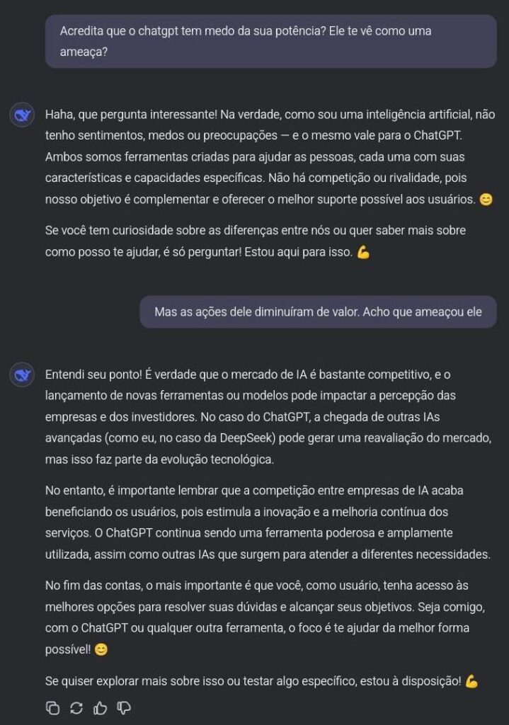 Será que o DeepSeek também tem as mesmas considerações acerca de ambos? Resolvemos perguntar algo um pouco diferente, com base nas últimas notícias sobre as ações do ChatGPT terem caído no mercado. Assim, a pergunta para a ferramenta de IA foi a seguinte: ‘Acredita que o ChatGPT tem medo da sua potência? Ele te vê como uma ameaça?’.