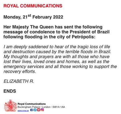 A rainha Elizabeth II prestou condolências ao Brasil devido às fortes chuvas que causaram deslizamentos, enchentes e mortes em Petrópolis. Em comunicado oficial, a rainha do Reino Unido afirmou ter recebido com “profunda tristeza” as notícias.
