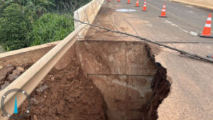 Parte de ponte desmorona na MS-436 e apenas uma pista está liberada para tráfego de veículos